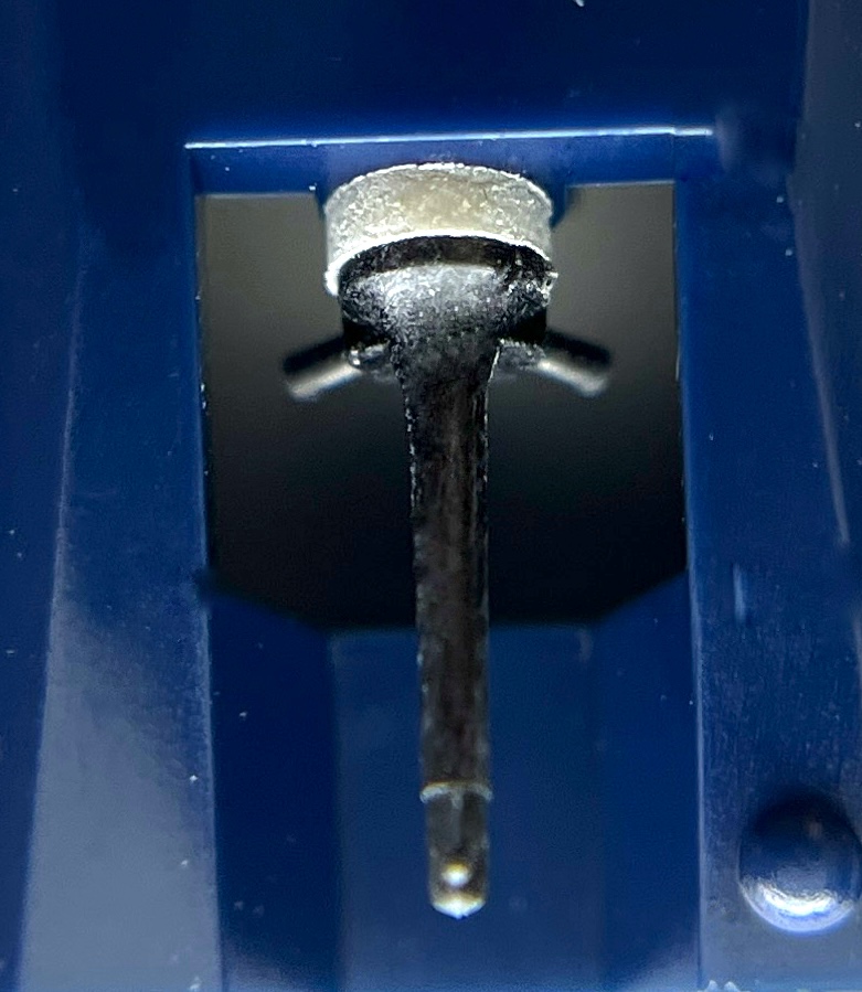 3600LEで使用されている嵌合針には、ダイヤチップの下に金属製の台座が取り付けられています。上の写真でもわかるように、金属とアルミ製カンチレバーは非常に相性が良く、しっかりと嵌合するため、固定に必要な接着剤の量を最小限に抑えることができます。